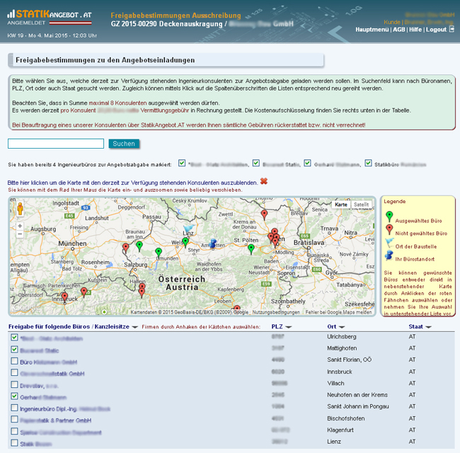 Dazu werden unsere im Datenbankpool eingetragenen national und international tätigen Ingenieurkonsulenten in unserem Namen (als Generalplaner) oder direktvermittelt für Sie Angebote exakt entsprechend Ihrer Ausschreibungsunterlagen erstellen. Vergleichen Sie Ihre eingelangten Angebote einzelner Konsulenten übersichtlich und unmittelbar auf unserer Plattform!